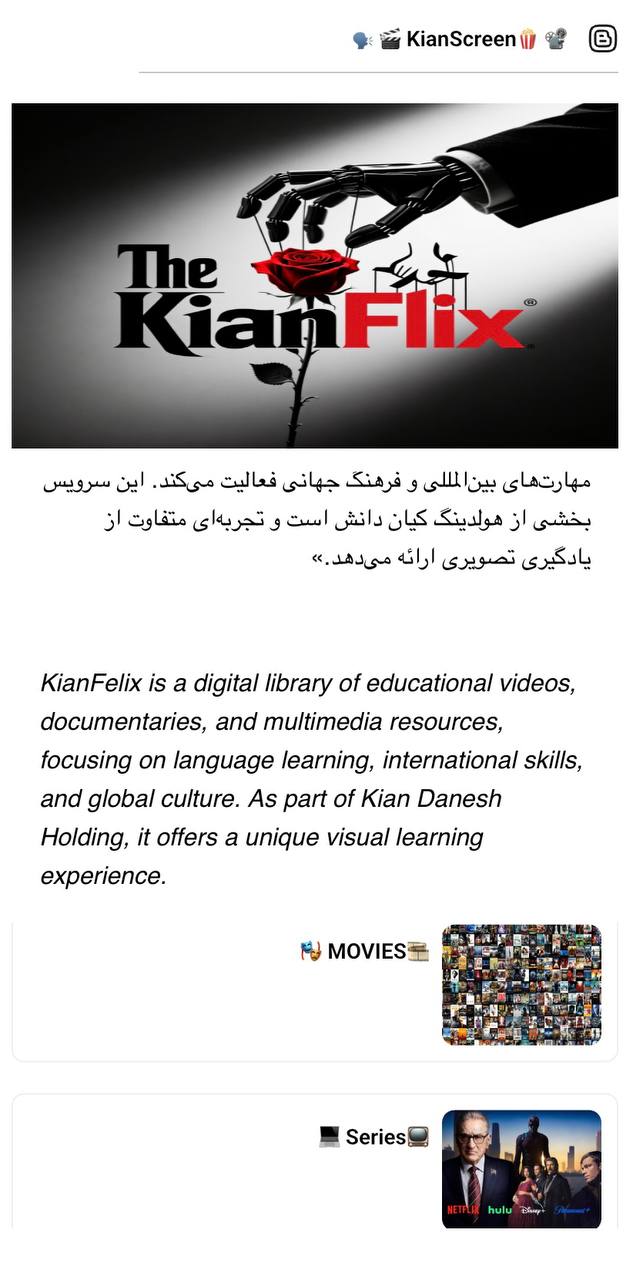برای دسترسی به دنیایی از فیلمها و سریالهای به روز، کافیست به اپلیکیشن آموزشگاه مراجعه کرده، وارد بخش Kianstream شوید و سپس بر روی Kianflix کلیک کنید. در آنجا میتوانید آیتم مورد علاقه خود را انتخاب کرده و از تماشای آن لذت ببرید.